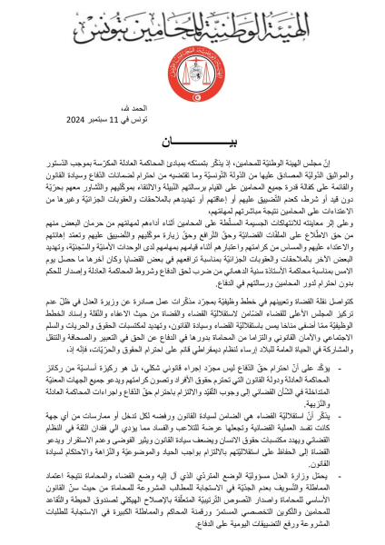 ولفت المجلس إلى “معاينته لانتهاكات جسيمة مسلطة على المحامين أثناء أدائهم لمهامهم من حرمان البعض منهم من حق الاطلاع على الملفات القضائية وحق الترافع وحق زيارة موكليهم والتضييق عليهم وتعمد إهانتهم والاعتداء عليهم والمساس من كرامتهم واعتبارهم أثناء قيامهم بمهامهم لدى الوحدات الأمنية والسجنية، وتهديد البعض الآخر بالملاحقات والعقوبات الجزائية بمناسبة ترافعهم في بعض القضايا”