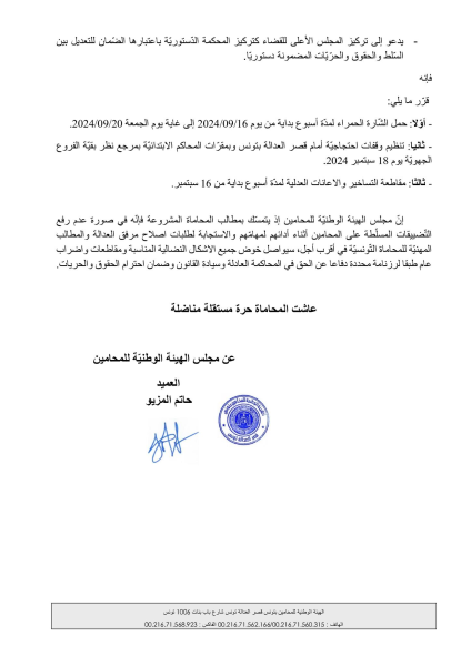 وحمّل وزارة العدل مسؤولية ما وصفه “بالوضع المتردي الذي آل إليه وضع القضاء والمحاماة نتيجة اعتماد المماطلة والتسويف بعدم الجدية في الاستجابة للمطالب المشروعة للمحاماة من حيث سن القانون الأساسي للمحاماة واصدار النصوص الترتيبية المتعلقة بالإصلاح الهيكلي لصندوق الحيطة والتقاعد للمحامين والتكوين التخصصي المستمر ورقمنة المحاكم”