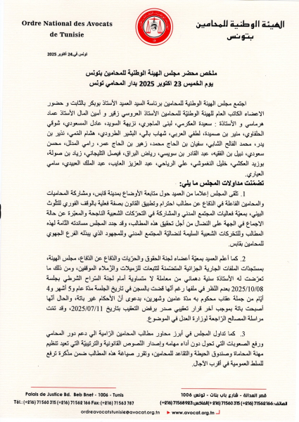 وقالت الهيئة في ملخص محضر مجلسها المنعقد يوم أمس الخميس 23 أكتوبر، نشرته عبر صفحتها الرسمية على الفيسبوك، أنه لم يتم في جلسة 8 أكتوبر النظر في ملف سنية الدهماني، رغم أنها قضت بالسجن في تاريخ الجلسة مدة عام و5 أشهر و4 أيام من جملة عقاب محكومة به مدة عامين وشهرين، بدعوى أن الأحكام غير باتة، والحال أنها أصبحت باتة بموجب آخر قرار تعقيبي صدر برفض التعقيب بتاريخ 11 جويلية المنقضي وفق نص الملخّص.