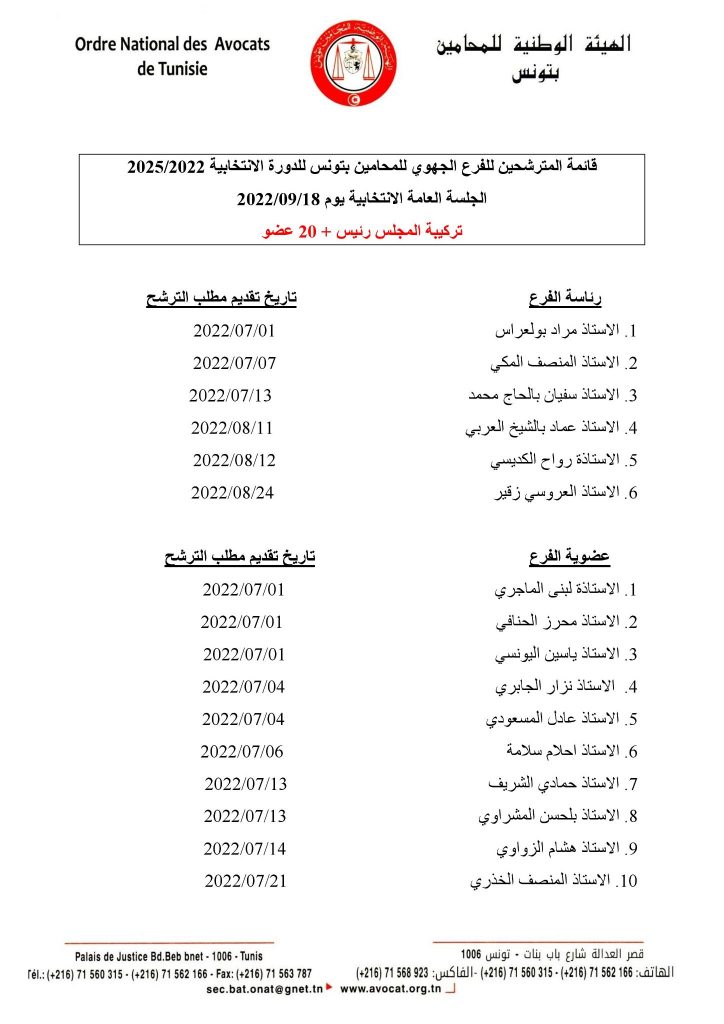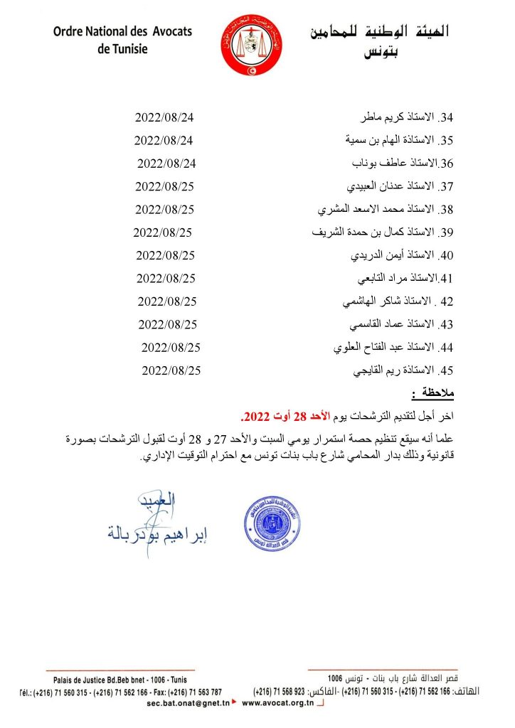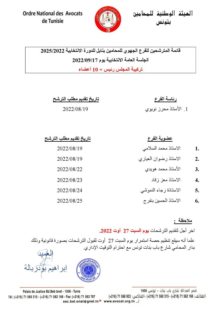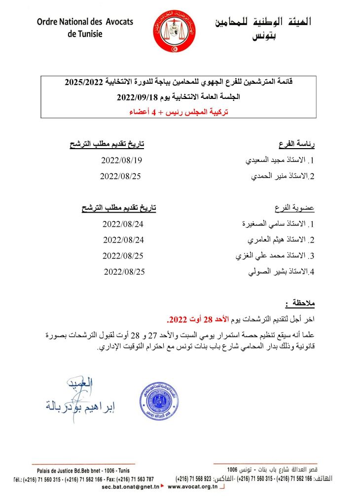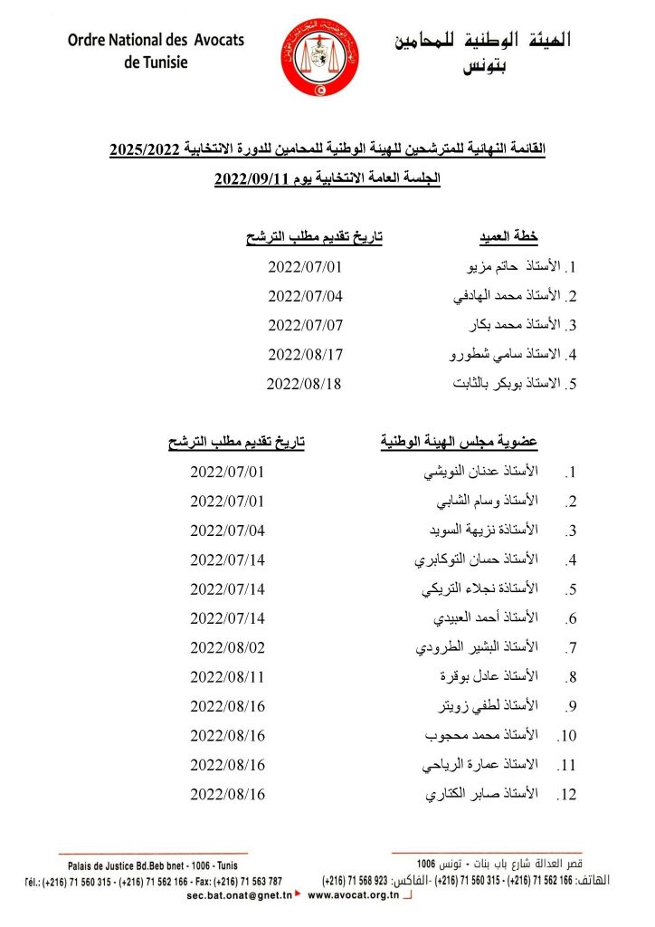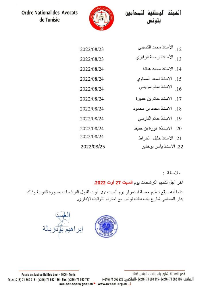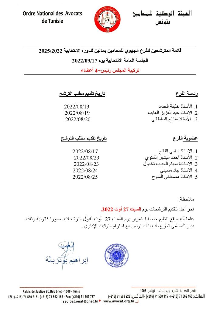 كشفت الهيئة الوطنية للمحامين في بلاغ لها نشرته اليوم الخميس 25 أوت 2022 عن القائمة الأولية للمترشحين لخطة العميد وعضوية الهيئة، فضلا عن رئاسة الفروع الجهوية وعضوياتها، مع تحديد يوم الأحد المقبل كآخر أجل لتقديم الترشحات.