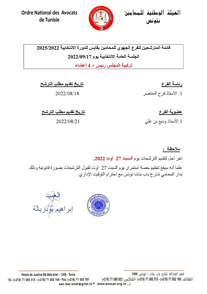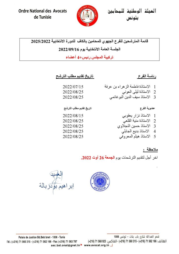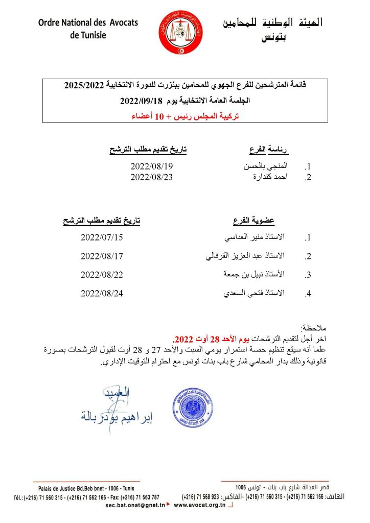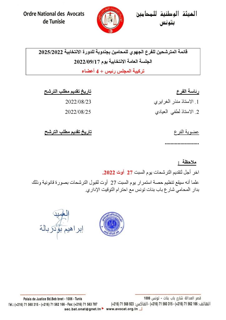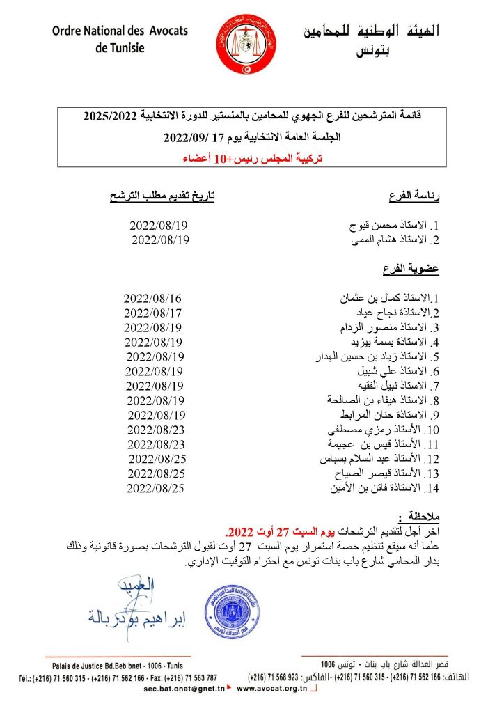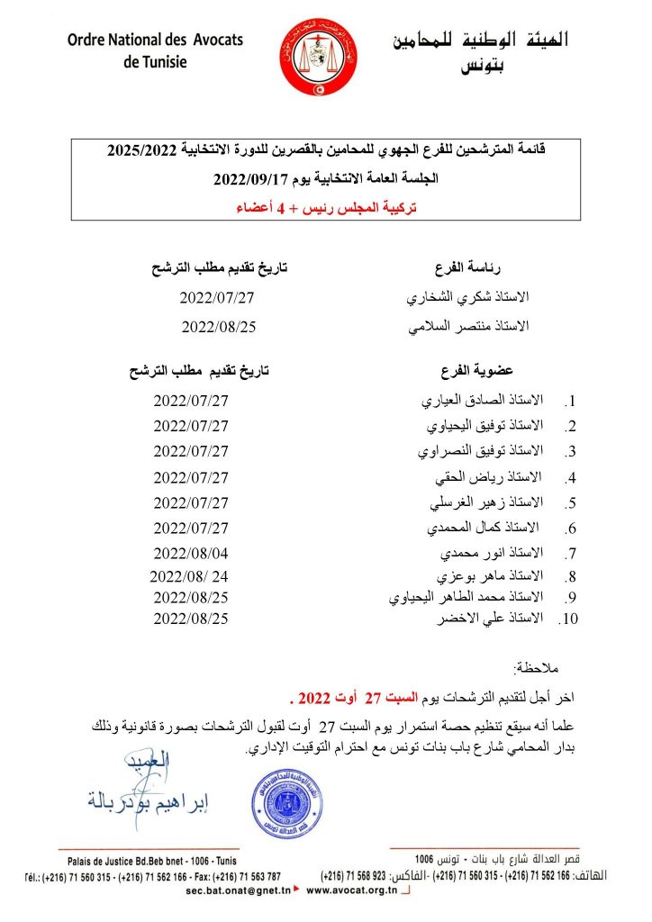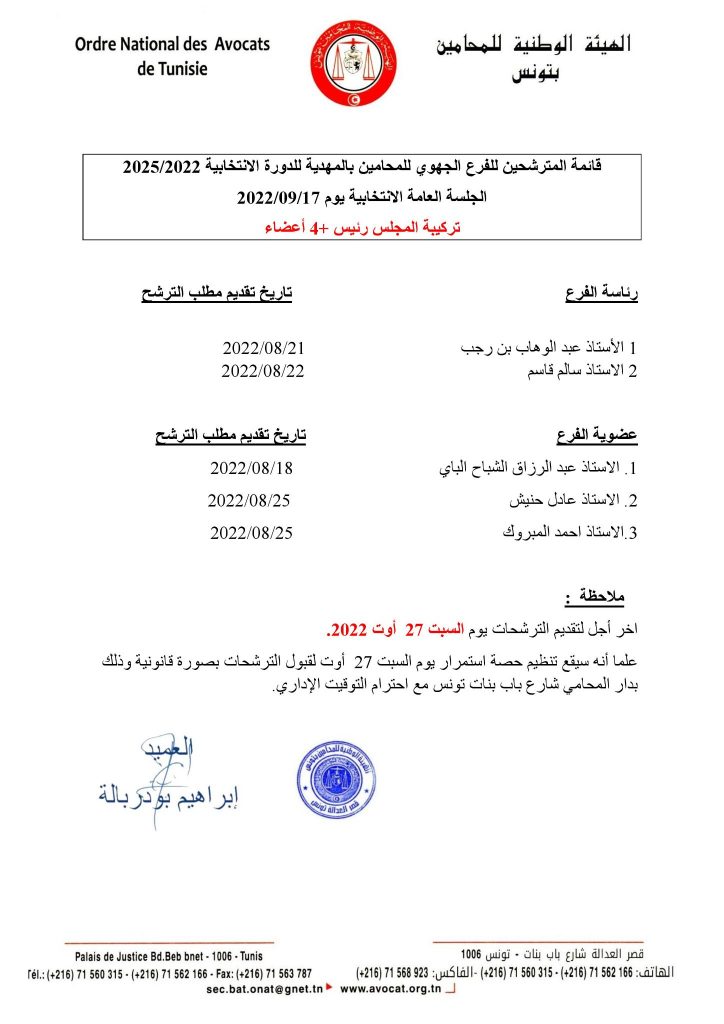كشفت الهيئة الوطنية للمحامين في بلاغ لها نشرته اليوم الخميس 25 أوت 2022 عن القائمة الأولية للمترشحين لخطة العميد وعضوية الهيئة، فضلا عن رئاسة الفروع الجهوية وعضوياتها، مع تحديد يوم الأحد المقبل كآخر أجل لتقديم الترشحات.