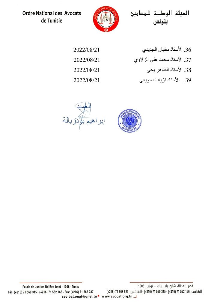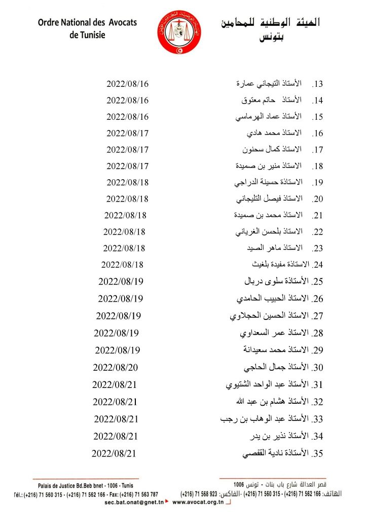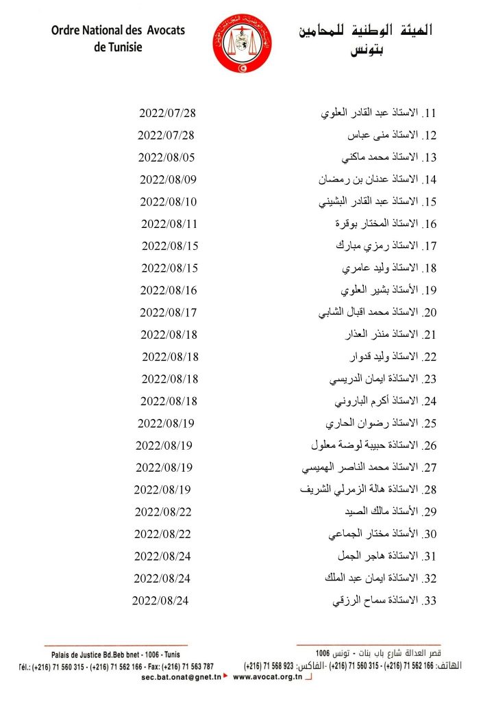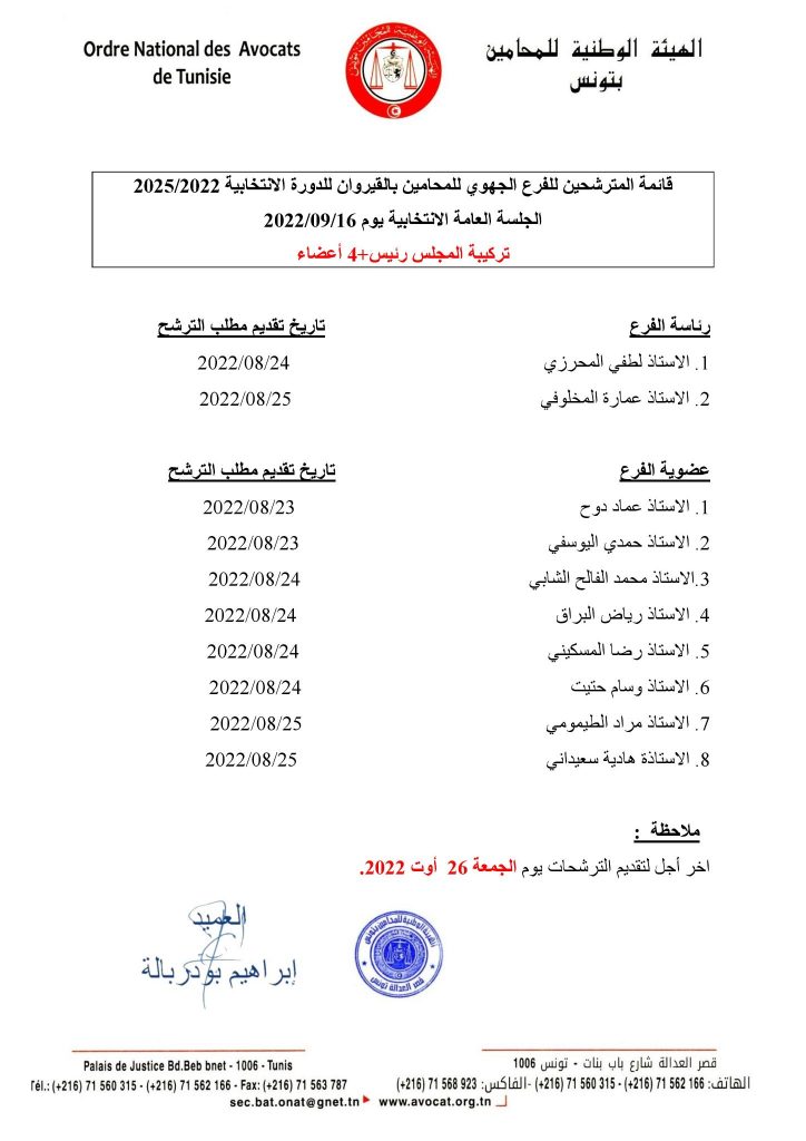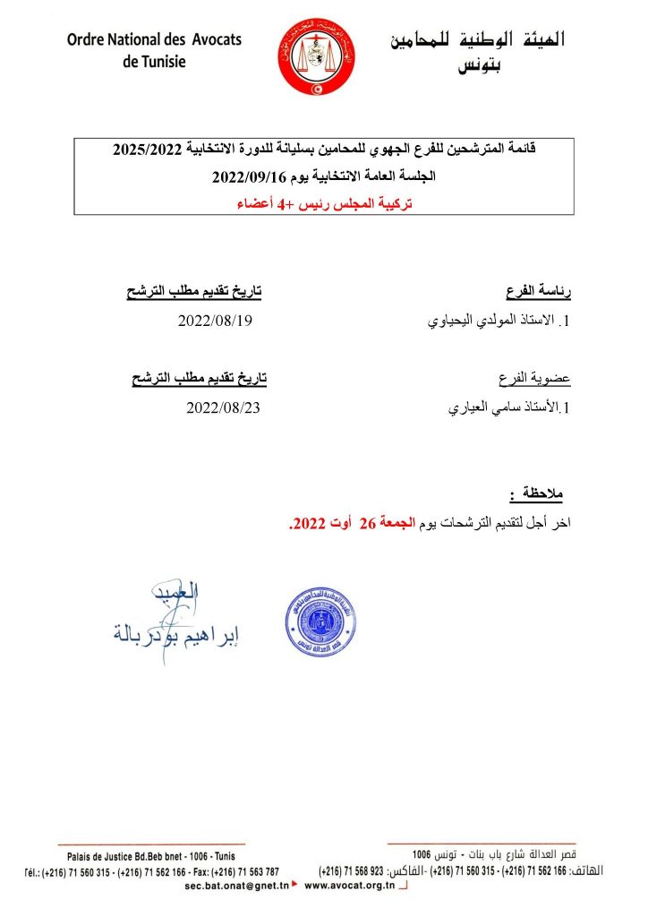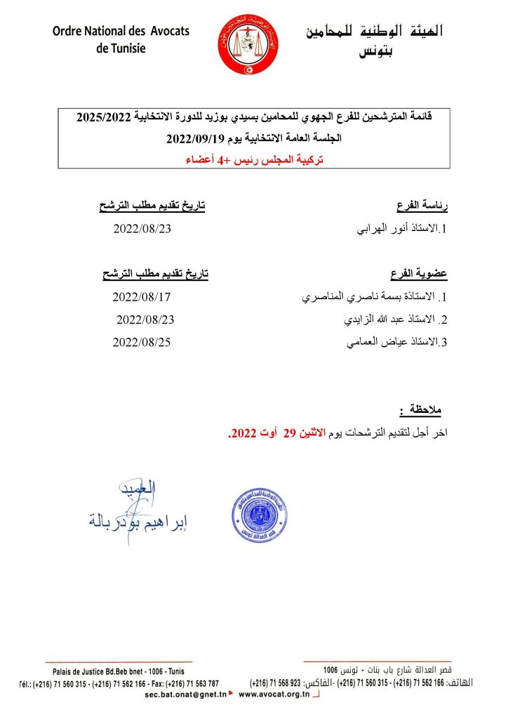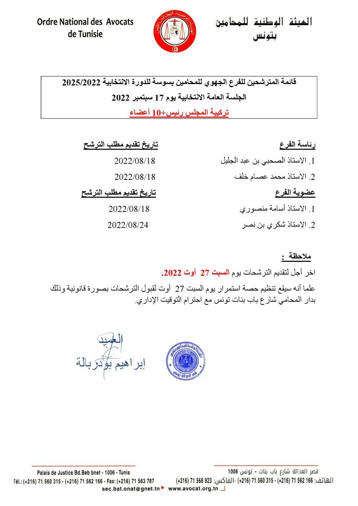 كشفت الهيئة الوطنية للمحامين في بلاغ لها نشرته اليوم الخميس 25 أوت 2022 عن القائمة الأولية للمترشحين لخطة العميد وعضوية الهيئة، فضلا عن رئاسة الفروع الجهوية وعضوياتها، مع تحديد يوم الأحد المقبل كآخر أجل لتقديم الترشحات.