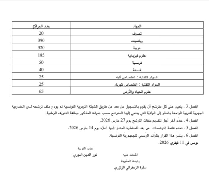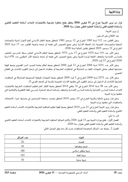 تفتح وزارة التربية يوم 13 أفريل 2026 والأيام الموالية المناظرة الخارجية لانتداب أساتذة تعليم ثانوي وأساتذة تعليم فني وأساتذة تعليم تقني بعنوان سنة 2026 وفق قرار صدر بالرائد الرسمي بتاريخ 11 فيفري 2026.