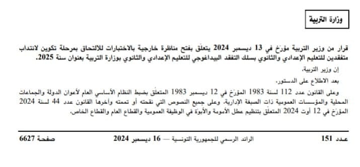 صدر قرار من وزير التربية نشر في الرائد الرسمي للجمهورية التونسية مؤرخ في 13 ديسمبر 2024 ويتعلق بفتح مناظرة خارجية لانتداب متفقدين للتعليم الابتدائي والإعدادي والثانوي.