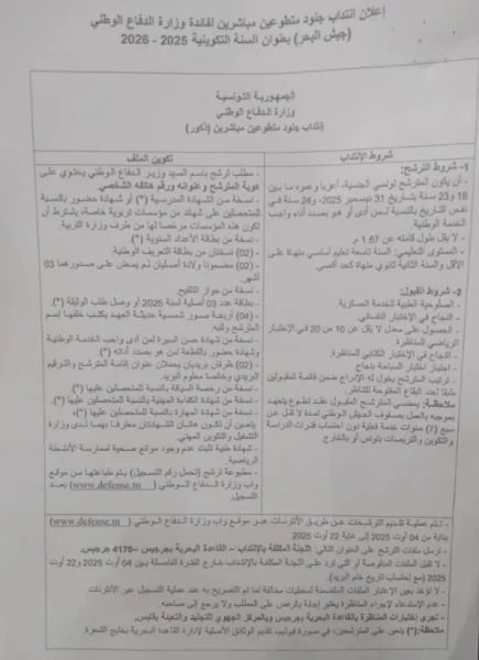 تنظم وزارة الدفاع الوطني، مناظرة لانتداب جنود متطوعين مباشرين (جيش البحر)، بعنوان السنة التكوينية 2025/2026.