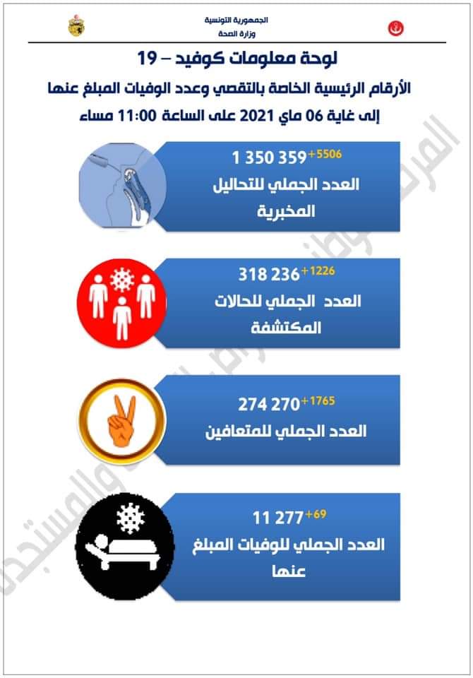 أعلنت وزارة الصحة، في بلاغ اليوم الجمعة 7 ماي 2021، تسجيل 1226 اصابة جديدة بفيروس كورونا المستجد خلال الـ24 ساعة الماضية، وبعد اجراء 5506 تحليلا مخبريا. كما تم تسجيل 69 حالة وفاة جديدة في نفس التاريخ، في حين تعافى 1765 من فيروس كوورنا المستجد.