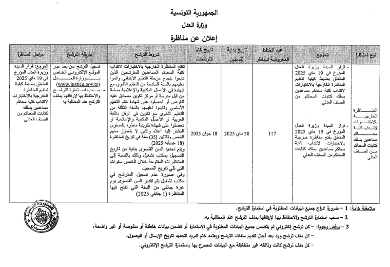 أعلنت وزارة العدل، اليوم الخميس، افتتاح المناظرة الخارجية بالاختبارات لانتداب كتبة محاكم مساعدين بسلك كتابات المحاكم من الصنف العدلي.