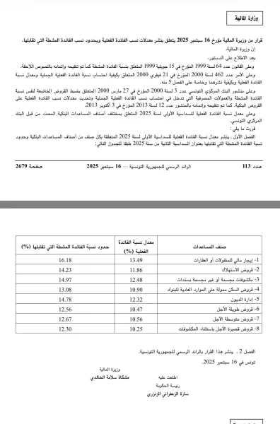 وطنية: نشرت وزارة المالية قرارا يوم 16 سبتمبر الجاري يتعلق بنشر معدلات نسب الفائدة الفعلية وبحدود نسب الفائدة التي تقابلها.