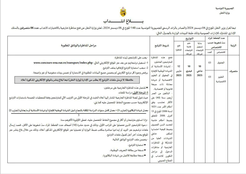 تبعا لقرار وزير النّقل المؤرّخ في 04 ديسمبر 2024 والصّادر بالرّائد الرّسمي للجمهورية التونسية عدد 148 المؤرّخ في 06 ديسمبر 2024، أعلنت وزارة النقل عن فتح مناظرة خارجيّة بالاختبارات لانتداب 06 متصرفين بالسلك الإداري المشترك للإدارات العموميّة.