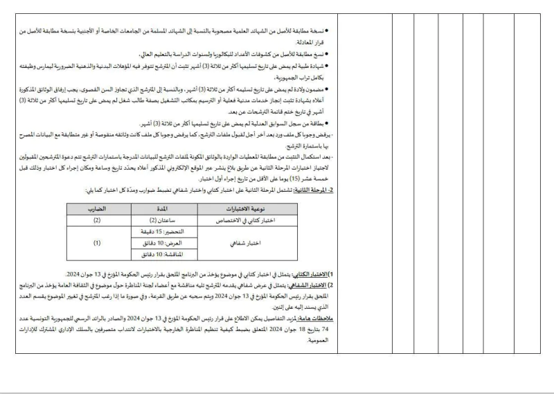 وقد قدمت الوزارة في بلاغ نشرته اليوم الجمعة 10 جانفي 2025، على صفحتها الرسمية على فايسبوك تفاصيل المشاركة في المناظرة والشروط وذلك طبقا للبيانات الواردة بالجدول التالي: