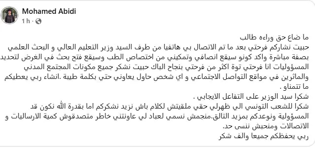 أفاد التلميذ محمد العبيدي المرسم بالسنة الرابعة علوم تجريبية بمعهد نهج أحمد عمارة بالكاف والذي نجح بتفوق في الدورة الرئيسية لإمتحان الباكالوريا بمعدل 18 من 20 بأن وزير التعليم العالي اتصل به شخصيا وأكد له أنه سيقع انصافه وتوجيهه إلى إحدى كليات الطب