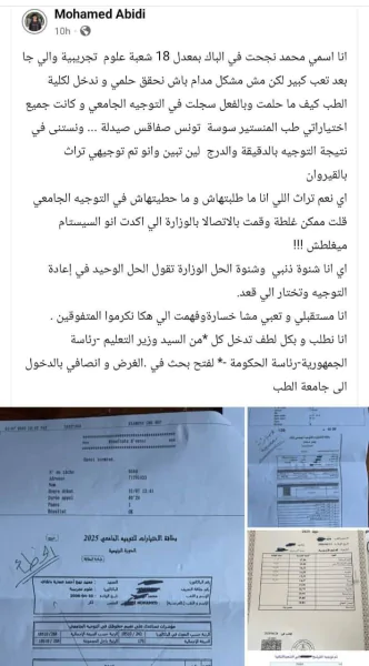 وللإشارة فقد تم توجيه التلميذ محمد العبيدي إلى كلية الآداب بالقيروان شعبة الإجازة في الآثار دون ان يطلب ذاك علاوة على انه تم تغيير الشعب التي قام بوضعها في بطاقة التوجيه دون علمه
