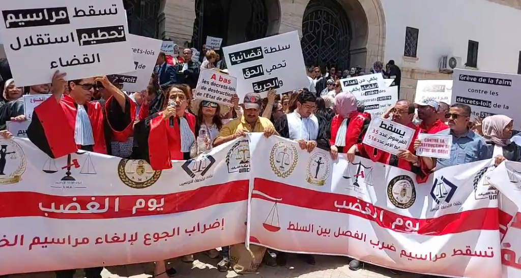 ورفع القضاة شعار “حريات.. حريات.. دولة البوليس وفات” و “الشعب يريد قضاء مستقل” و”إضراب الجوع لإلغاء مراسيم الخضوع” مطالبين رئيس الجمهورية بالتراجع عن اعفاء قائمة الـ 57 والترّاجع على المرسوم 35، ويذكر أنّ القضاة وجّهوا مطلبا للقاء رئيس الجمهوريّة ولكن لم يتلقوا إلى اليوم اي إجابة.