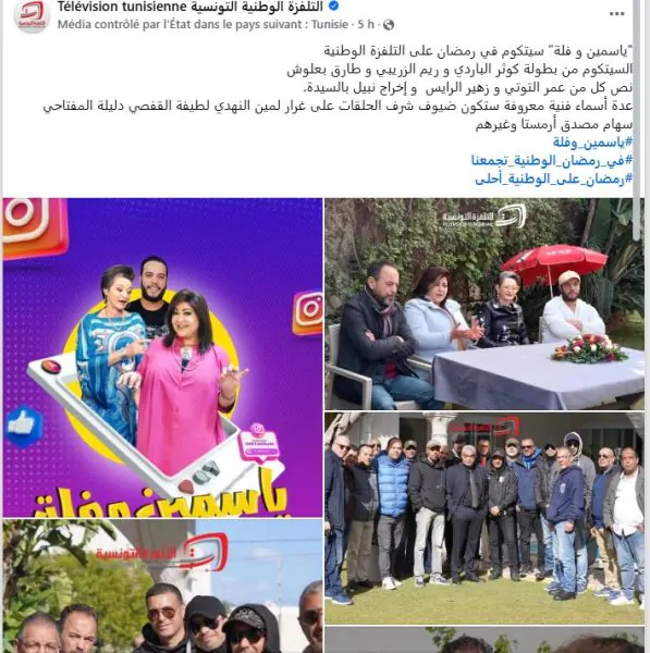 ثقافة: أعلنت القناة الوطنية عن بث سلسلة هزلية ''ياسمين و فلة" على القناة الوطنية الاولى خلال شهر رمضان 2025. قراءة المزيد أعلنت القناة الوطنية عن بث سلسلة هزلية ”ياسمين و فلة” على القناة الوطنية الاولى خلال شهر رمضان 2025. و تلعب كل من الممثلة كوثر الباردي والممثلة ريم الزريبي والممثل طارق بعلوش دور البطولة و من إخراج نبيل بالسيدة و سيناريو لكل من عمر التوتي و زهير الرايس.وزارة التجارة: 13071 مخالفة اقتصادية منذ بداية رمضانكم بيضة يستهلاك التونسي يوميا في رمضان؟ (تصريح لـ"تونس الان")حيل للتغلب على العطش والصداع في رمضانالمزيد من الأخبار وستشارك عدة أسماء فنية معروفة كضيوف شرف في “ياسمين و فلة” على غرار لمين النهدي لطيفة القفصي دليلة المفتاحي سهام مصدق أرمستا وغيرهم