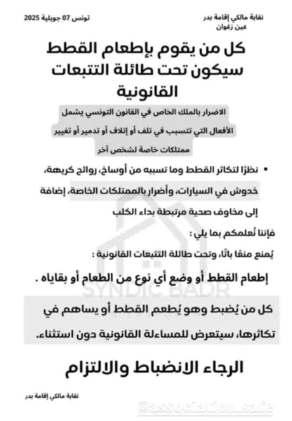 هذه الوثيقة التي خلفت صدمة لدى التونسيين جاء فيها تهديدا بالتتبع القانوني لكل من يقوم باطعم القطط امام بهو العمارة بتعلة انها تسبب الاوساخ والروائح الكريهة وتضر بالممتلكات العامة وتخدش السيارات .