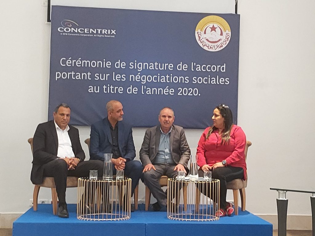 أشرف أمس الثلاثاء الأمين العام لاتحاد الشغل نور الدين الطبوبي بحضور محمد علي البوغديري الأمين العام المساعد المسؤول عن قسم القطاع الخاص وومحمد الشابي الكاتب العام للاتحاد الجهوي للشغل بأريانة وعلي ورق الكاتب العام للجامعة العامة والإدارة العامة للشركة والنقابة الأساسية على حفل امضاء اتفاق الزيادات في أجور العاملين بمركز النداء كونسونتريكس.