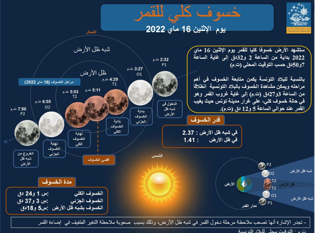 بالنسبة للبلاد التونسة يكمن مشاهدة أهم مراحل الخسوف انطلاقا من فجر يو الإثنين 16 ماي على الساعة 3و27دق (ت.م) عند بداية دخول القمر في ظل الأرض، إلى غاية غروب القمر وهو في حالة خسوف كلي.