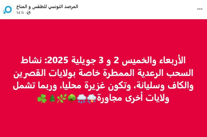وطنية: كشف المرصد التونسي للمناخ والطقس ان بعض المناطق ستشهد يومي الأربعاء والخميس 2 و 3 جويلية 2025 نشاط السحب الرعدية الممطرة قراءة المزيد كشف المرصد التونسي للمناخ والطقس ان بعض المناطق ستشهد يومي الأربعاء والخميس 2 و 3 جويلية 2025 نشاط السحب الرعدية الممطرة وقال المرصد ان هذه السحب الرعدية الممطرة ستكون بولايات القصرين والكاف وسليانة، وتكون غزيرة محليا، وربما تشمل ولايات أخرى مجاورةاليوم وغدا.. سحب رعدية مع أمطار غزيرةطقس ليل 9 سبتمبر 2025.. سحب رعدية مع أمطار غزيرةمرصد الطقس: توقعات بنشاط سحب رعدية غدا السبت بهذه المناطقالمزيد من الأخبار