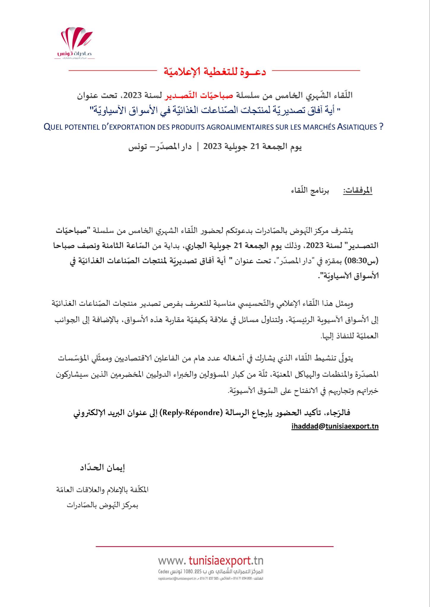من المنتظر أن ينعقد يوم الجمعة 29 سبتمبر2023 بداية من السّاعة التّاسعة صباحا، بدار المصدر، اللقاء الشهري السّادس من سلسلة “صباحيّات التصدير” لسنة 2023.